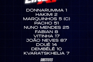 巴黎首發(fā):1-多納魯馬;2-阿什拉夫、5-馬爾基尼奧斯、51-帕喬、25-門德斯;8-法比安、17-維蒂尼亞、87-若昂-內(nèi)維斯、14-杜埃、10-登貝萊、7-克瓦拉茨赫利亞