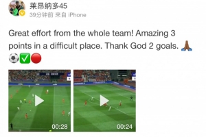 賽后萊昂納多更新社媒,曬出自己兩個進球的視頻,并配文寫道:“多虧了全隊的巨大努力!在客場艱難收獲3分,感謝上帝,本場我收獲兩個進球?!?/p>