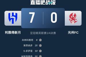 體育資訊04月26日訊 亞冠精英聯(lián)賽1/4決賽,利雅得新月7-0橫掃光州FC晉級四強(qiáng)。