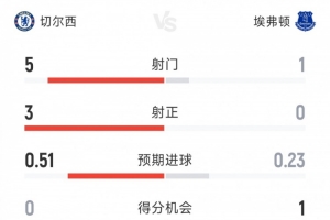 體育資訊4月26日訊 本輪英超切爾西對陣埃弗頓上半場結束,藍軍憑借杰克遜進球暫時領先,以下為雙方半場數(shù)據(jù)對比:
