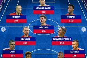 基米希(254場)、施魏因施泰格(148場)、穆勒(500場)