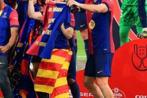 本場比賽費蘭打進關(guān)鍵進球,賽后慶祝奪冠時費蘭亮出寫有祝福已故隊醫(yī)卡萊斯-米尼亞羅-加西亞話語的球衣。在今年3月,巴薩一線隊隊醫(yī)卡萊斯-米尼亞羅-加西亞不幸離世。