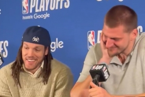 賽后,掘金球星阿隆-戈登和約基奇出席了新聞發(fā)布會。對于約基奇三分不進自己補扣絕殺那球,戈登打趣約基奇:“傳得漂亮。Airballs(三不沾)真的很難防守?!?/p>