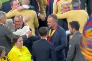 科貝電臺記者Víctor Navarro在社交媒體上曬出巴薩賽后慶祝的視頻,巴薩主席拉波爾塔與主帥弗里克擁抱。