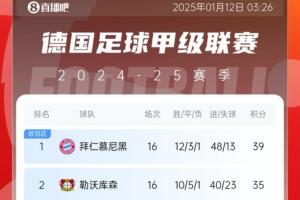 德甲積分榜:拜仁4分優(yōu)勢(shì)領(lǐng)跑,鎖定德甲半程冠軍