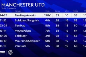 2024-25賽季(尚未結束):滕哈赫/阿莫林 15位 33戰(zhàn)10勝 積38分 場均1.15分