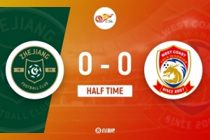 傷停補(bǔ)時(shí)1分鐘。上半場(chǎng)比賽結(jié)束,浙江0-0青島西海岸。