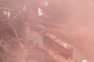 利物浦官方社媒曬出球隊大巴抵達安菲爾德的畫面,并配文:多么棒的入場??