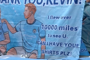 該名球迷手持德布勞內海報,并寫道:“謝謝你,德布勞內!我跨越萬里只為來見你,請問我能得到你的球衣嗎?”