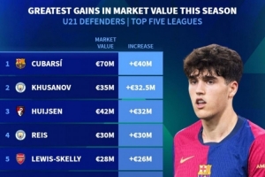 五大聯(lián)賽U21后衛(wèi)本賽季身價上漲排行: