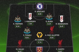 中場(chǎng):托納利(紐卡斯?fàn)柭?lián))、庫(kù)尼亞(狼隊(duì))、麥卡利斯特(利物浦)