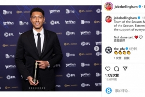 喬布-貝林厄姆入選英冠賽季最佳陣容,并當(dāng)選最佳年輕球員,他在社交媒體上寫道:“賽季最佳陣容&賽季最佳年輕球員。非常感激身邊所有人的支持。未完待續(xù)…”