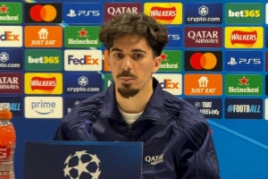 體育資訊4月29日訊 北京時間4月30日3:00,歐冠1/4決賽首回合,巴黎客場挑戰(zhàn)阿森納。賽前,巴黎中場維蒂尼亞出席新聞發(fā)布會。