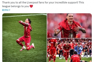 努涅斯配文寫(xiě)道:“夢(mèng)想成真:這是我生涯第一個(gè)英超冠軍。感謝所有利物浦球迷的鼎力支持!聯(lián)賽冠軍屬于你們!”