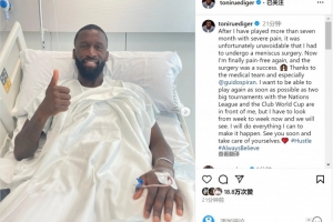 呂迪格社媒曬出自己躺在病床上豎大拇指的照片,并寫道:“在忍受嚴(yán)重疼痛踢了7個(gè)多月比賽之后,我不得不接受半月板手術(shù),很遺憾這是無法避免的?!?/p>