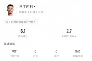 體育資訊4月30日訊 歐冠半決賽首回合,阿森納0-1不敵巴黎。本場(chǎng)比賽,馬丁內(nèi)利首發(fā)打滿全場(chǎng),評(píng)分6.1分全場(chǎng)最低。
