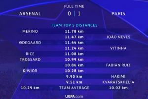 體育資訊4月30日訊 阿森納在歐冠半決賽首回合0-1不敵巴黎,本場比賽的跑動(dòng)數(shù)據(jù)也已經(jīng)出爐。