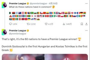 值得一提的是,英超聯(lián)賽官方羅列出了60個國家和地區(qū),其中包括中國。英超聯(lián)賽指出,這是所有奪得英超聯(lián)賽的球員所屬國籍的集合。