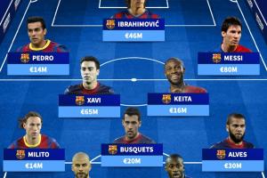 巴薩:巴爾德斯(1800萬歐)、加布里埃爾-米利托(1400萬歐)、皮克(2500萬歐)、圖雷(1800萬歐)、阿爾維斯(3000萬歐)、布斯克茨(2000萬歐)、哈維(6500萬歐)、凱塔(1600萬歐)、佩德羅(1400萬歐)、伊布(4600萬歐)、梅西(8000萬歐)