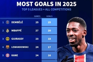 體育資訊5月1日訊 德轉(zhuǎn)列出2025年五大聯(lián)賽球員射手榜,登貝萊各項賽事25場比賽打進25球居首,姆巴佩第二,萊萬、凱恩前五。