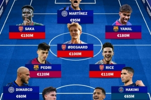 前鋒:薩卡(阿森納,1.5億歐)、勞塔羅(國米,9500萬歐)、亞馬爾(巴薩,1.8億歐)
