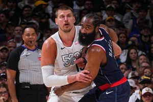 你瞧,周三進(jìn)行的第五場(chǎng)比賽幾乎以非常相似的方式展開(kāi)。就像他們?cè)谥苋账龅哪菢?,掘金?duì)在第四節(jié)建立了22分的領(lǐng)先優(yōu)勢(shì)??齑?duì)再次縮小了分差。在比賽還剩4分01秒時(shí),掘金隊(duì)的領(lǐng)先優(yōu)勢(shì)被縮小到了9分。那么,快船隊(duì)是如何完成這次險(xiǎn)些成功的反撲的呢?他們憑借的是又一個(gè)不尋常的防守策略??齑?duì)讓身高6英尺5英寸(約合1.96米)的后衛(wèi)詹姆斯-哈登去防守約基奇。