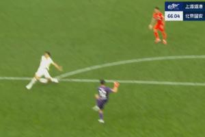 體育資訊05月01日訊 國(guó)安vs海港比賽第66分鐘,海港門將陳威傳球送禮,張?jiān)磫蔚渡溟T被擋出。