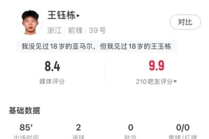 體育資訊5月1日訊 中超第10輪,浙江隊4-2擊敗亞泰,王鈺棟梅開二度,他賽后獲評8.4分,全場最佳。