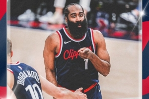 比賽結(jié)束后,快船官推曬出了本場的贏球海報(bào),哈登登上封面。