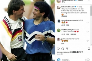 馬特烏斯社媒曬出與馬拉多納的合照,配文:“這張照片拍攝于1990年決賽的前一天,在奧林匹克球場的最后一場訓練。”