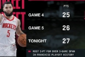 據(jù)統(tǒng)計,在最近三場比賽中,范弗里特一共命中18記三分,創(chuàng)火箭隊史季后賽連續(xù)3場三分命中新紀錄!