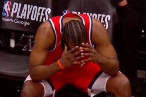 比賽結(jié)束后哈登在替補(bǔ)席抱頭,看起來非常失落!