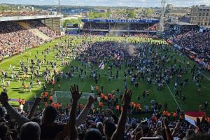 最終在第96分鐘,薩爾塞維奇將隊(duì)友拉普利斯的射門(mén)擋入球門(mén),布拉德福德球迷再也無(wú)法抑制內(nèi)心的激動(dòng),集體沖入場(chǎng)內(nèi)慶祝。場(chǎng)內(nèi)球員無(wú)奈敦促球迷回到看臺(tái),比賽因此暫停10分鐘,但比賽恢復(fù)后再也沒(méi)有意外發(fā)生,布拉德福德取勝,力壓沃爾索爾鎖定第三,時(shí)隔12年再度升入英甲。