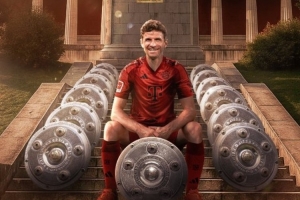 拜仁提前2輪鎖定本賽季德甲冠軍,這也是穆勒職業(yè)生涯獲得的第13座德甲獎杯,拜仁官方社媒曬出海報,稱贊他的偉大成就。