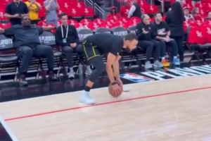 賽前,勇士當(dāng)家球星庫里在熱身中“母雞下蛋”式將球傳給場外,隨后接回傳底角三分飚中。