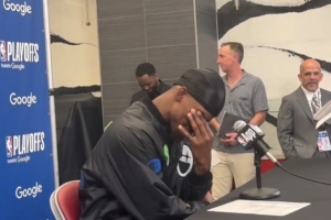 賽后,巴特勒在接受記者采訪時(shí),身后的希爾德打趣道:“告訴他們(記者),你不再是羅賓了?!卑吞乩章牶笾苯与p手捂眼睛。