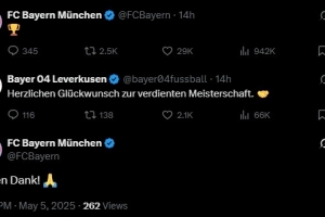 體育資訊5月5日訊 勒沃庫森在今天凌晨的德甲戰(zhàn)平后拜仁提前奪冠,賽后,勒沃庫森官推向拜仁表示祝賀,拜仁也回應(yīng)了感謝。