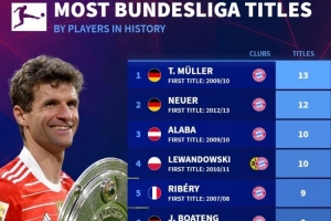體育資訊5月5日訊 德國(guó)轉(zhuǎn)會(huì)市場(chǎng)統(tǒng)計(jì)了球員的德甲奪冠次數(shù),并列出榜單,穆勒13冠居首,諾伊爾12冠次席,阿拉巴、萊萬(wàn)10冠。