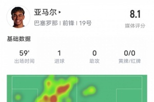亞馬爾本場比賽數(shù)據(jù)如下: