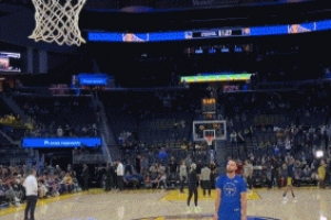 賽前熱身時(shí),庫(kù)里和助教上演排球式傳球,隨后庫(kù)里空接上籃命中。