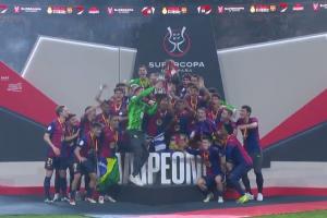 體育資訊01月13日訊 西超杯決賽,巴薩5-2戰(zhàn)勝皇馬奪冠。賽后,巴薩教練組和球員上臺領(lǐng)取冠軍獎牌。