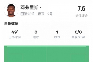 體育資訊5月7日訊 歐冠半決賽次回合,國際米蘭主場迎戰(zhàn)巴塞羅那。鄧弗里斯首發(fā)出戰(zhàn),半場戰(zhàn)罷貢獻(xiàn)1次助攻,送出2次關(guān)鍵傳球,3次過人2次成功,評分7.6。