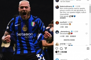 國米球員迪馬爾科社媒曬出激情慶祝的照片,并配文:“無論還剩多少時間,雨下得多大,對手是誰。在圣西羅,身穿這件球衣,沒有什么是不可能的!嗨,偉大的家伙們!”