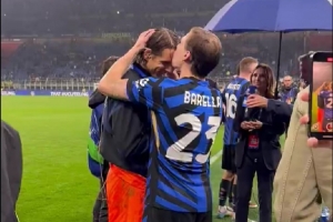 本場比賽,國米門將索默屢獻(xiàn)神撲,賽后被評(píng)為全場最佳。球員在接受采訪時(shí),隊(duì)友巴雷拉抱著他在額頭親了兩口。