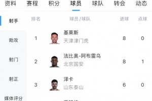 體育資訊5月7日訊 中超已經(jīng)結束11輪爭奪,射手榜方面,基萊斯、法比奧8球領跑,澤卡、克雷桑、王鈺棟、韋林頓-席爾瓦6球。