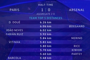 巴黎vs阿森納上半場跑動數(shù)據(jù):