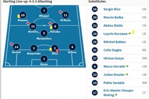 巴黎首發(fā):1-納瓦斯、4-科雷爾、2-蒂亞戈-席爾瓦、3-金彭貝、14-貝爾納特、21-埃雷拉、5-馬爾基尼奧斯、8-帕雷德斯、11-迪瑪利亞、7-姆巴佩、10-內(nèi)馬爾