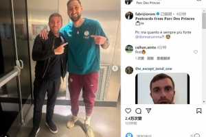 知名記者羅馬諾更新社媒動(dòng)態(tài),曬出與巴黎門將多納魯馬的合照,配文:“來自王子公園球場的明信片。PS:他到底能變強(qiáng)到什么地步?!”