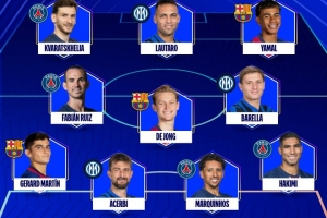 體育資訊5月8日訊 歐冠官方公布了歐冠半決賽次回合的最佳11人陣容,勞塔羅、K77、亞馬爾、馬丁入選。