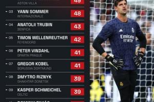 體育資訊5月9日訊 Squawka統(tǒng)計了本賽季歐冠門將撲救次數(shù)排名,庫爾圖瓦居首,大馬丁、索默分列二三名。